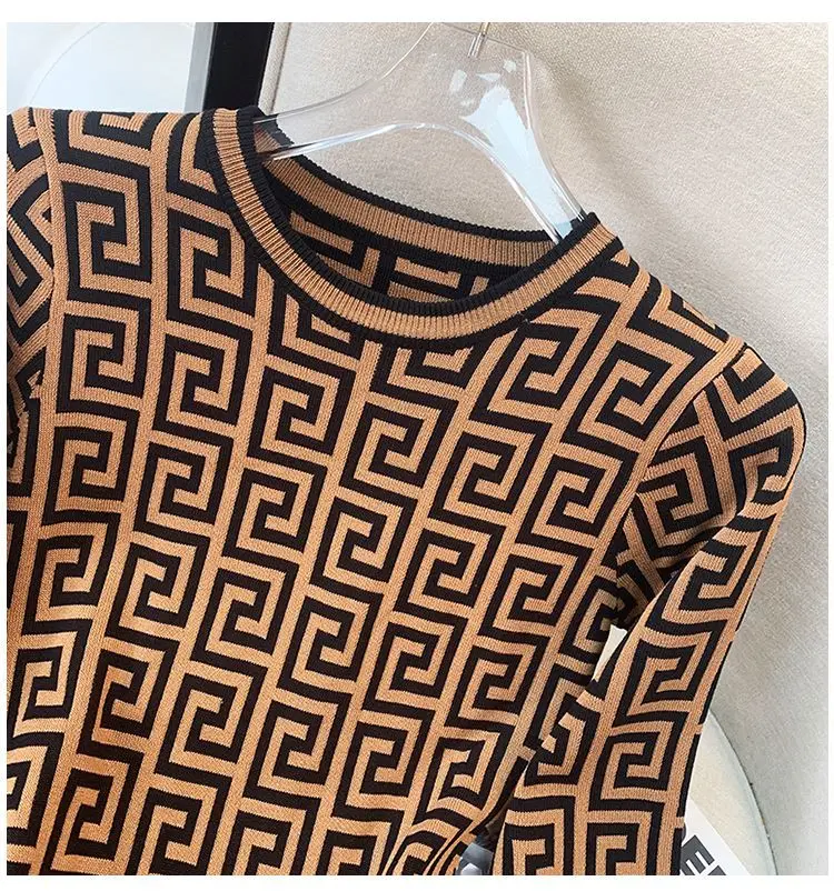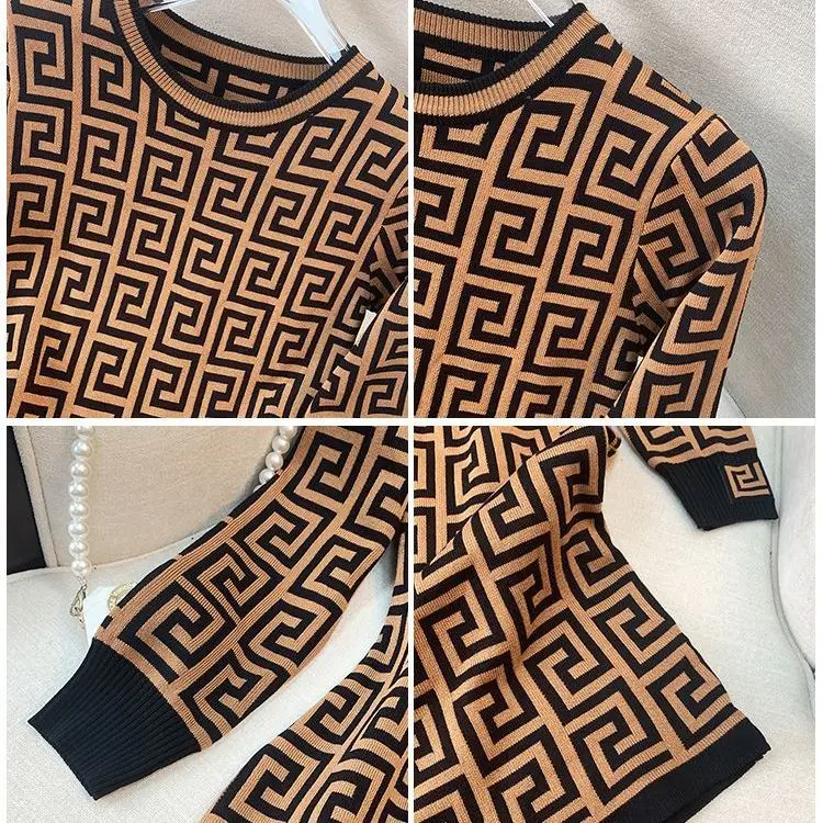 Autumn Winter vintage jacquard knitting midi dress Women elegant temperament Long sleeve A-line skirt All-match Casual dresses
